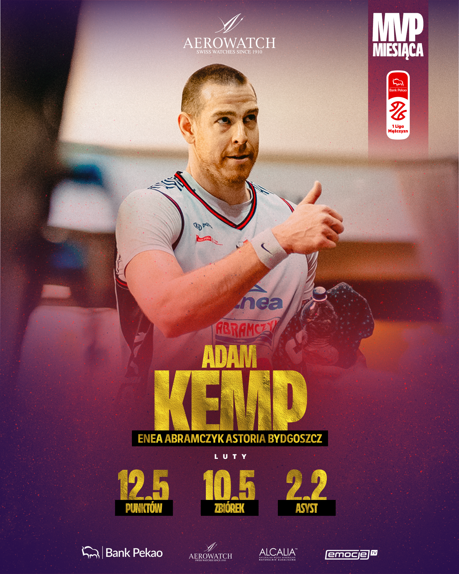 W nagrodę, przed meczem 27. kolejki Pekao S.A 1 Ligi Mężczyzn z Decką Pelplin, Adam Kemp otrzyma wysokiej klasy zegarek marki Aerowatch.