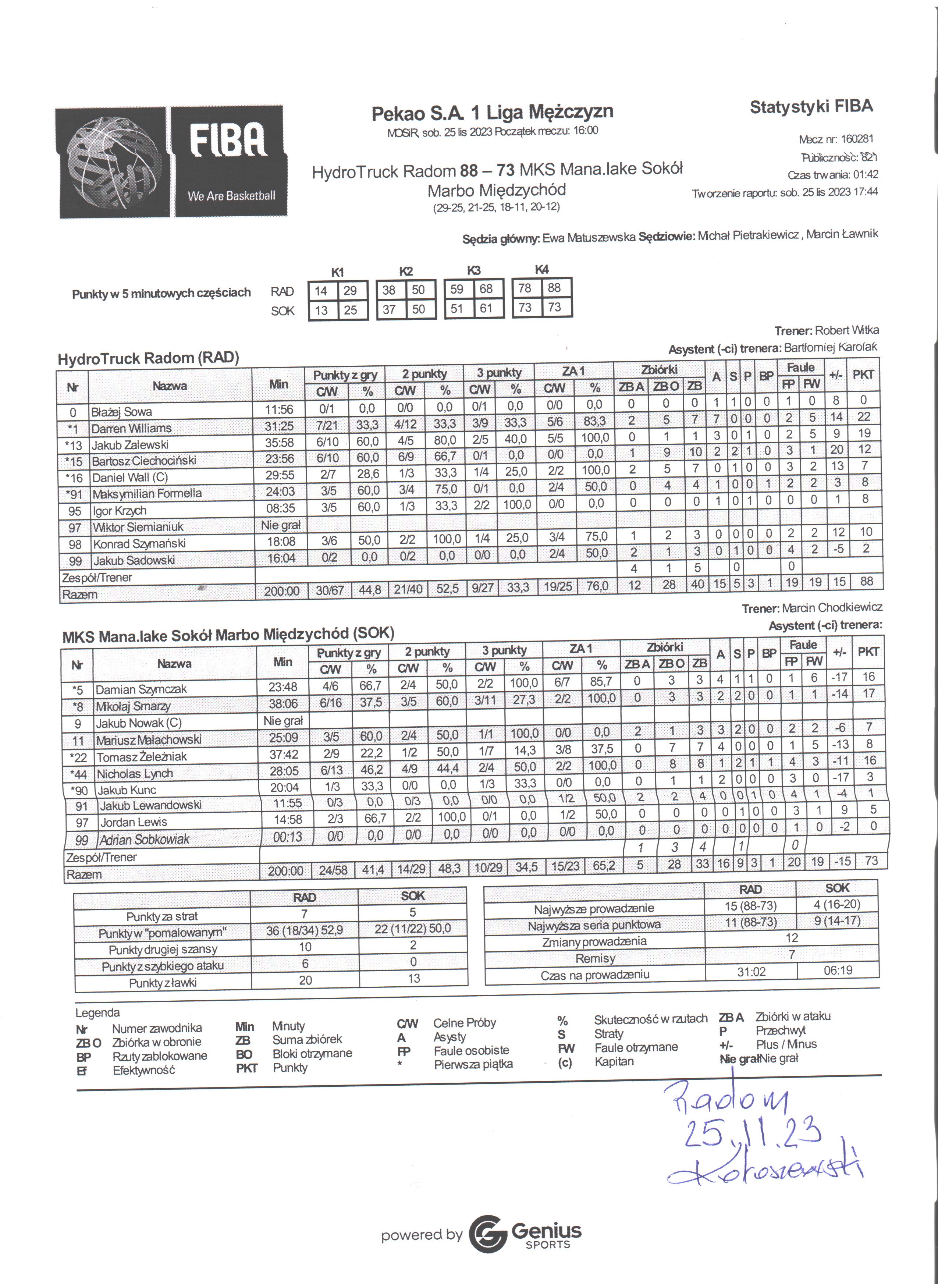 | HydroTruck Radom | Kwarta 1 | MKS Mana.lake Sokół Marbo Międzychód | ||