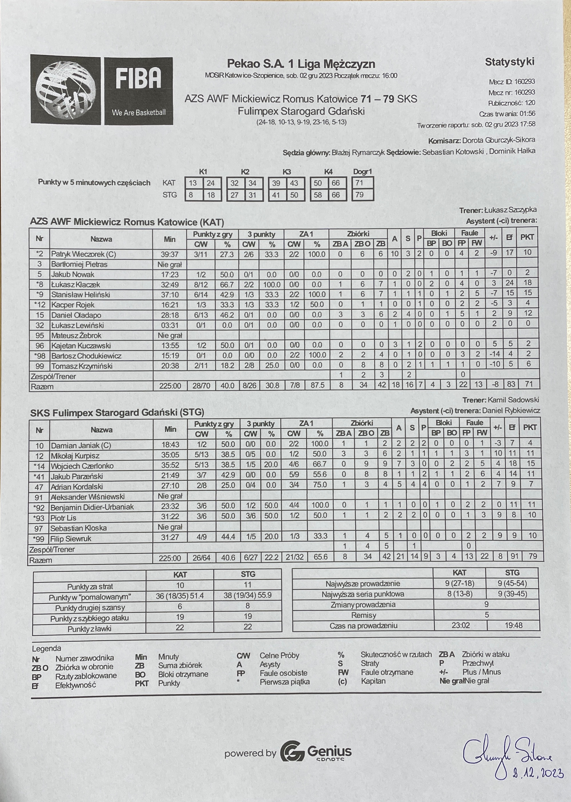 | 47 | Adrian Kordalski | 7 | 27:10 | 2/4 | 50.0 | 0/4 | 0.0 | 2/8 | 25.0 | 3/4 | 75.0 | 1 | 3 | 4 | 5 | 1 | 2 | 4 | 4 |   |   | 9 | 7 | |