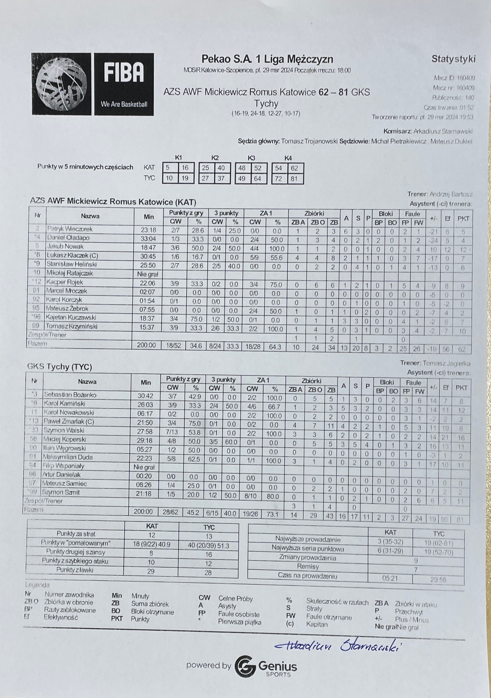 | AZS AWF Mickiewicz Romus Katowice | Kwarta 1 | GKS Tychy | ||
