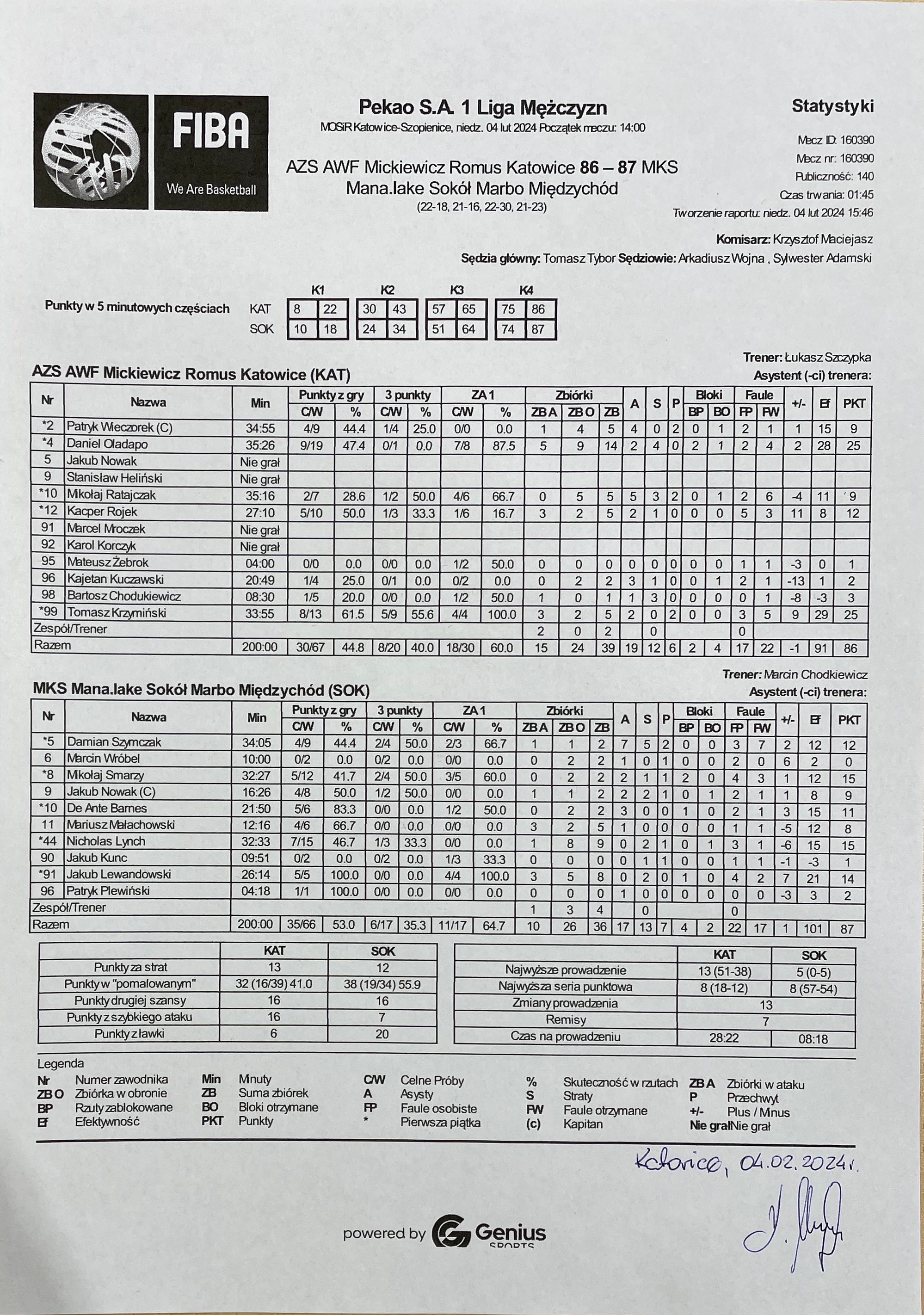 | 99 | Tomasz Krzymiński | 25 | 33:55 | 3/4 | 75.0 | 5/9 | 55.6 | 8/13 | 61.5 | 4/4 | 100.0 | 3 | 2 | 5 | 2 | 3 | 5 |   | 2 |   |   | 29 | 9 | |