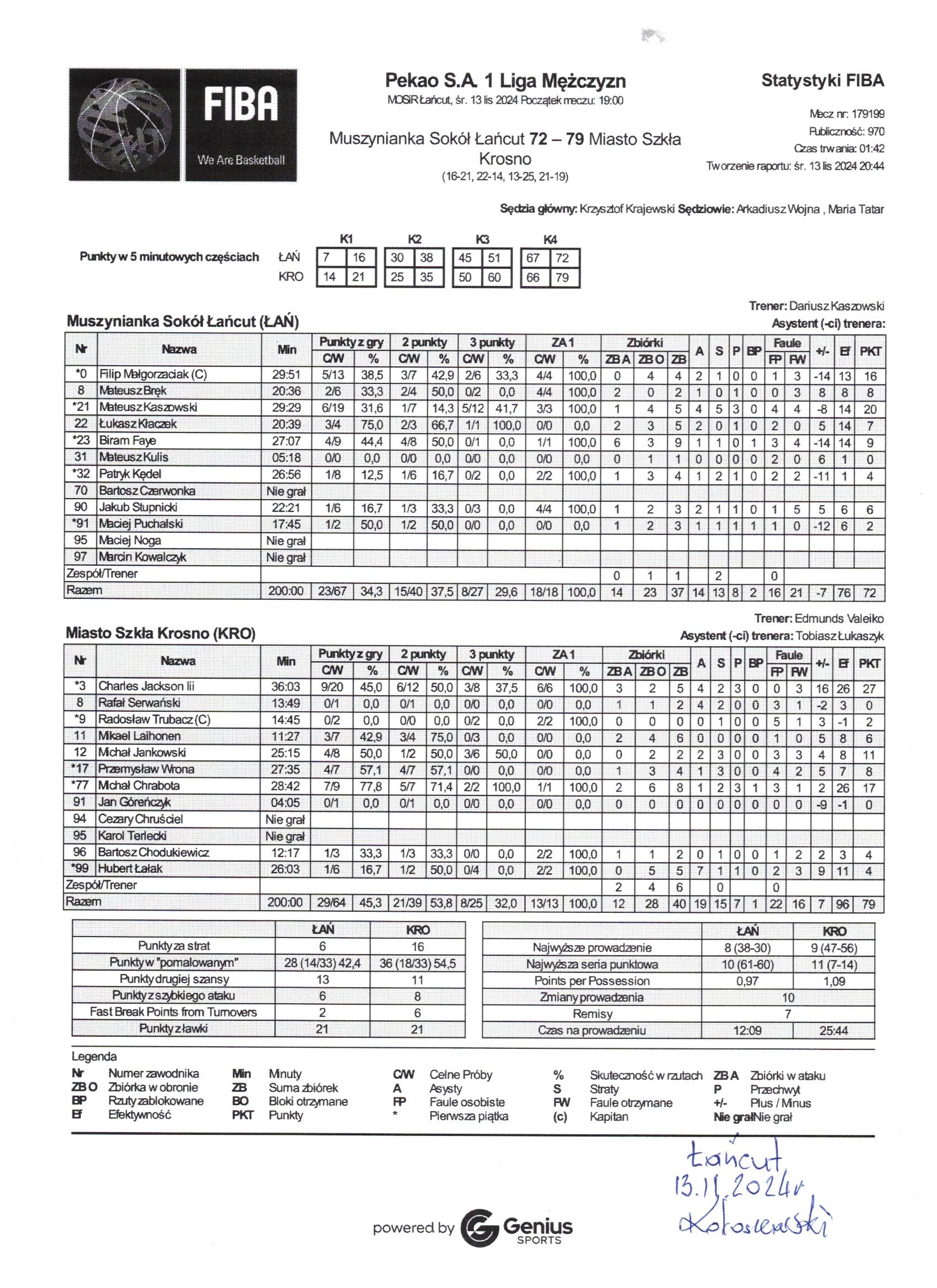| 99 | Hubert Łałak | 4 | 26:03 | 1/2 | 50.0 | 0/4 | 0.0 | 1/6 | 16.7 | 2/2 | 100.0 |   | 5 | 5 | 7 | 2 | 3 | 1 | 1 |   |   | 11 | 9 | |