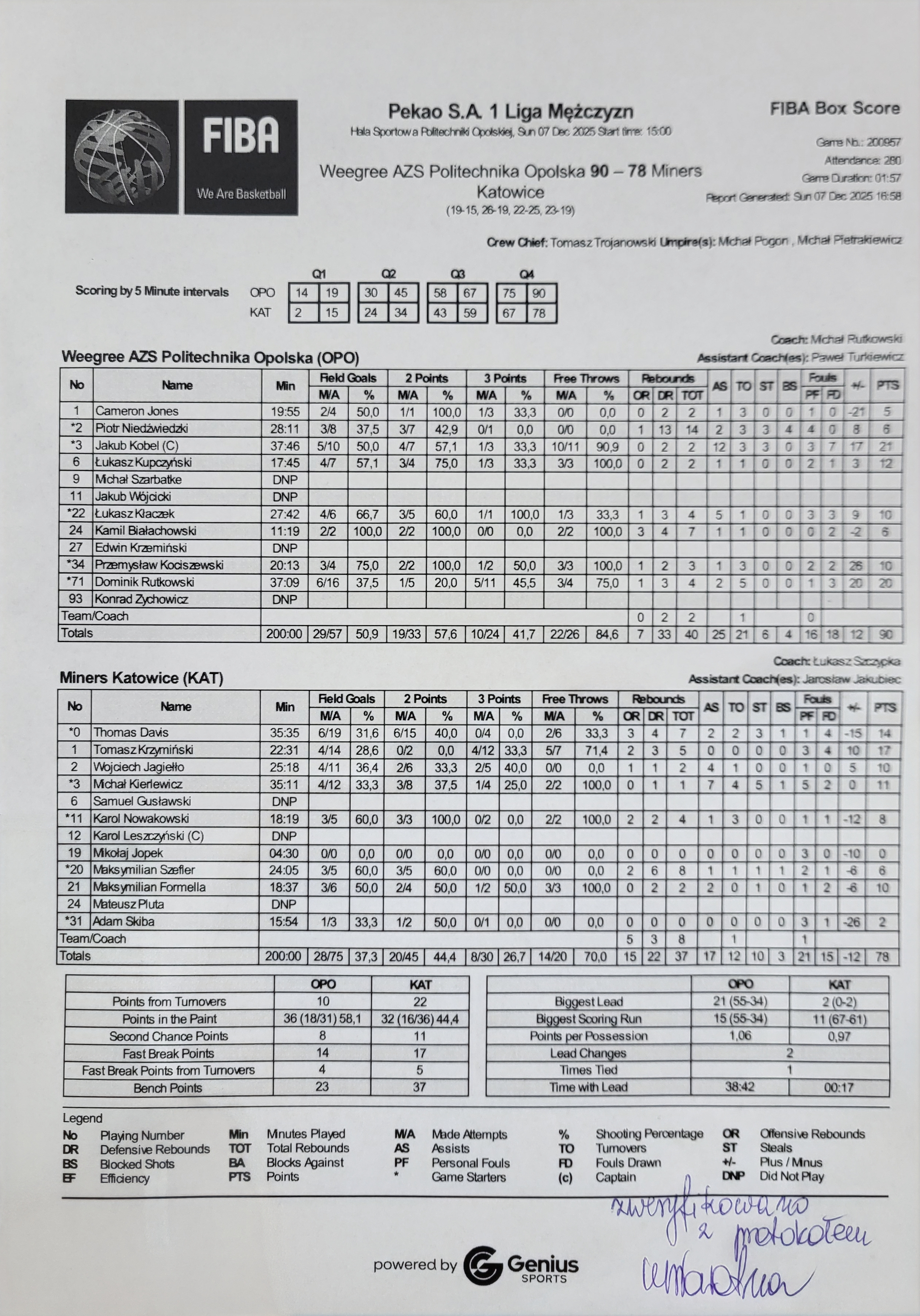 | 6 | Łukasz Kupczyński | 12 | 17:45 | 3/4 | 75.0 | 1/3 | 33.3 | 4/7 | 57.1 | 3/3 | 100.0 |   | 2 | 2 | 1 | 2 | 1 | 1 |   |   | 1 | 11 | 3 | |